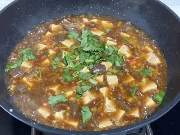 6、出锅之前加入香菜段,我们的肉末豆腐鸭血就完成了!
