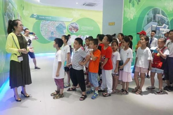 △小学员们参观健康体验馆了解中医悠久的养生文化,参与人机互动:测量身高体重