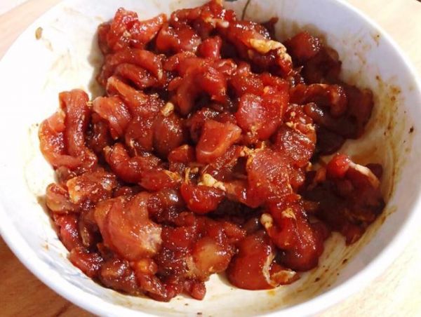同时,把瘦肉切成薄片,用生粉和盐腌制10分钟,以入味。