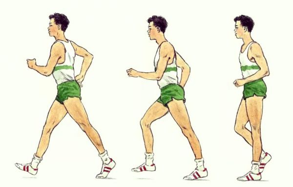 相比之下,竞走时始终保持一只脚与地面接触。当摆动腿的脚跟即将触地时,后蹬腿的脚尖应依旧贴地,以避免出现腾空动作。此外,无论是在单脚支撑还是双脚支撑的阶段,或是脚从着地到离地的瞬间,从摆动腿触地开始,直至腿部呈垂直状态,整个腿部都必须保持直线状态,膝盖不得弯曲,形成一种独特的运动形态,既非纯粹的跑动也非静止不动。