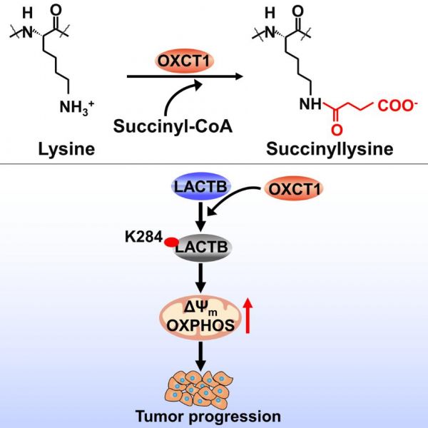 酮体代谢对生理稳态的调控非常重要,OXCT1是酮体分解代谢过程中的关键限速酶,催化琥珀酰辅酶A中的辅酶A基团转移至乙酰乙酸形成乙酰乙酰辅酶A。张华凤课题组前期研究发现,OXCT1在肝癌中被诱导激活,促进酮体分解利用而加速肝癌进程 (Cell research,2016;26(10):1112-1130)。1月3日本团队发表了新的研究进展,发现OXCT1是一种新型的琥珀酰基转移酶,调控抑癌蛋白酶LACTB等的琥珀酰化,从而促进肝癌, 相关成果以题为OXCT1 functions as a succinyltransferase contributing to hepatocellular carcinoma via succinylating LACTB发表在国际知名期刊《Molecular Cell》上。