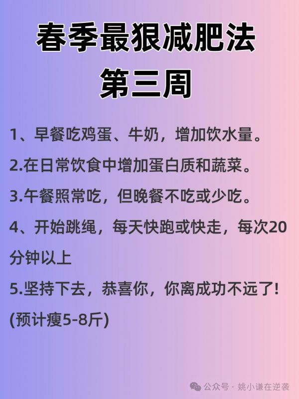 第三周是减肥的关键阶段。早餐可以吃鸡蛋、牛奶,增加饮水量,在日常饮食中要增加蛋白质和蔬菜的摄入。午餐照常吃,但晚餐要少吃或者不吃。同时,要开始运动了,每天跳绳,或者进行20分钟以上的快跑或快走。运动能够加速脂肪的燃烧,配合饮食的调整,让减肥效果更加显著。坚持下去,离成功就不远了!预计本周能瘦5 - 8斤。