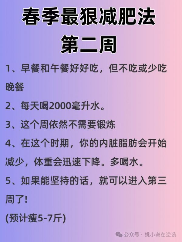 进入第二周,我们要进一步控制晚餐的摄入。早餐和午餐可以好好吃,但晚餐尽量不吃或者少吃。同时,每天要保证喝2000毫升的水,促进新陈代谢。这一周依然不需要锻炼,但随着饮食的调整,内脏脂肪会开始减少,体重也会迅速下降。只要坚持住,就能顺利进入下一周。预计本周能瘦5 - 7斤。