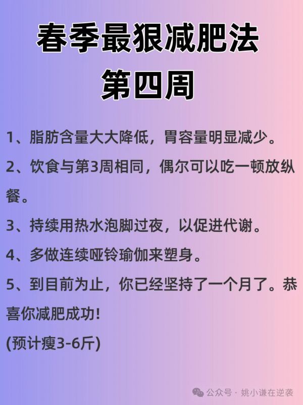 到了第四周,脂肪含量已经大大降低,胃容量也明显减少。饮食可以继续保持和第三周相同,偶尔还可以吃一顿放纵餐,满足一下味蕾。同时,持续用热水泡脚过夜,促进代谢。多做连续哑铃瑜伽来塑身,让身材更加完美。坚持了一个月,恭喜你,减肥成功!预计本周能瘦3 - 6斤。
