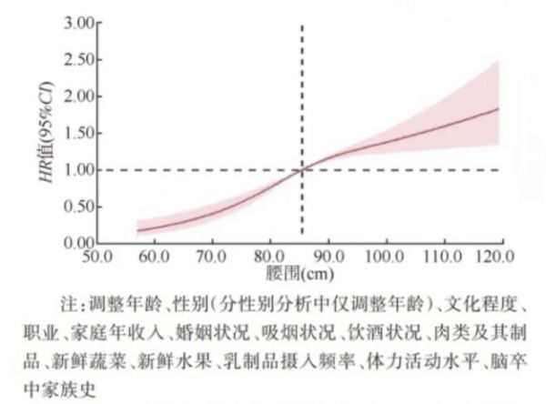 分析显示,腰围与脑梗塞风险呈非线性的“s”形关系,即当腰围超标时,脑梗塞风险随着腰围的增加呈上升趋势,当腰围大于85.5厘米时,脑梗塞风险上升较快。