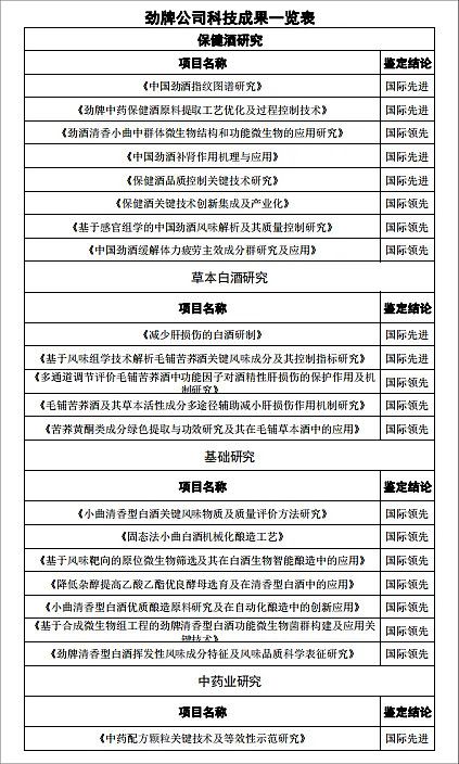 截至目前,劲牌共有21项科技成果被鉴定为达到“国际领先(先进)水平”,拥有110项国家授权发明专利,获得国家级、省部级以上科技进步奖21项。