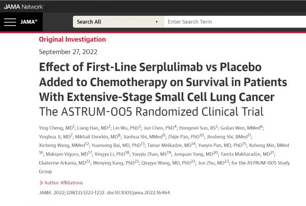 2022年9月27日,由程颖教授牵头的国际多中心研究——ASTRUM-005研究在全球四大顶级医学期刊之一的《美国医学会杂志》(JAMA,影响因子:157.3)在线发表,成为全球首个登上JAMA主刊的小细胞肺癌免疫治疗临床研究。ASTRUM-005研究是复宏汉霖自主研发的抗PD-1单抗H药 汉斯状®(斯鲁利单抗)联合化疗一线治疗广泛期小细胞肺癌(ES-SCLC)的Ⅲ期临床研究,2022年ASCO年会程颖教授首次报告结果后,引起了全球同行的广泛关注,而今再度登上国际顶级学术舞台,体现了国际学术界的高度认可,彰显出中国研究者的智慧化和生物医药领域国际一流的自主创新实力和临床运营能力。