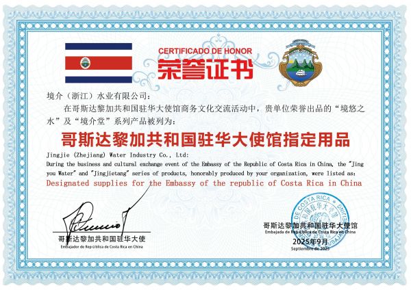 2025 年 9 月,境介(浙江)水业有限公司旗下 “境悠之水” 及 “境介堂” 系列产品,正式被授予 “哥斯达黎加共和国驻华大使馆指定用品” 认证。这不仅是 “境悠之水”“境介堂” 获得的第 8 家驻华大使馆认可(此前已获赤道几内亚、利比亚、尼日利亚、马达加斯加、科特迪瓦、几内亚、布隆迪驻华大使馆指定选用),更标志着中国原创健康水品牌与健康管理服务,首次进入美洲国家驻华外交圈,为中哥经贸文化交流增添 “健康纽带”。