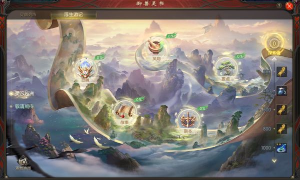 打开灵兽,选择浮生游记,可以看到任务一共有五条支线,分别是风物,景点,灵兽,故事,副本。我们只要完成以下的任务,就能获得探索值,领取对应的奖励,需要注意的是,探索值满1000,才可以领取自动寻路的道具哦。