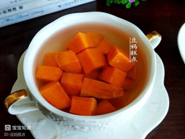 2、将红薯块放入大碗里,加入清水浸泡10分钟,换水,再浸泡再换水,重复3-4次,至水清澈(这样做出来汤色才会清亮哦)。