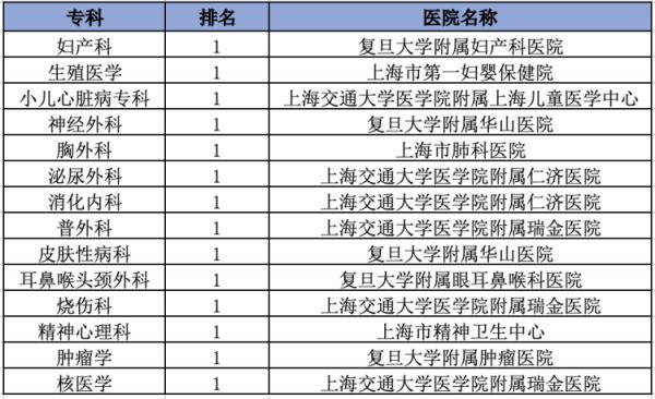 在全部37个专科中,上海市10家医院蝉联14个专科的榜首,分别是: