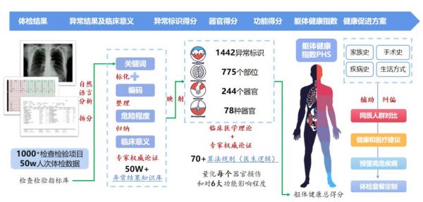 面对大量体检“信息”,研究团队优先提取反映同一异常点下精确性最高的检查结果。在明确临床意义的基础上,量化及可视化表达每个异常点的危险程度,并映射至78种器官、244个器官(骨头没有完全细分)、775个部位的1442个异常标识上,经70+条算法规则,模仿医生看报告的逻辑,自动量化和反映人体每个器官及每个部位的损伤程度,结果经多轮权威专家论证;结合人体自身的调节、缓冲和功能代偿的机制,系统量化各器官、部位损伤在人体六大正常功能实现上的影响程度,通过层级算法,最终获得躯体健康总得分。
