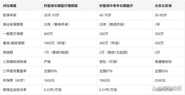 医疗险是最复杂的险种。好医保旗舰版适合55岁以下健康人群,而好医保中老年版则是慢性病患者的优选。特别提醒:重大疾病(注:此处特指银保监会规定的28+3种)保障范围需特别注意条款细节。