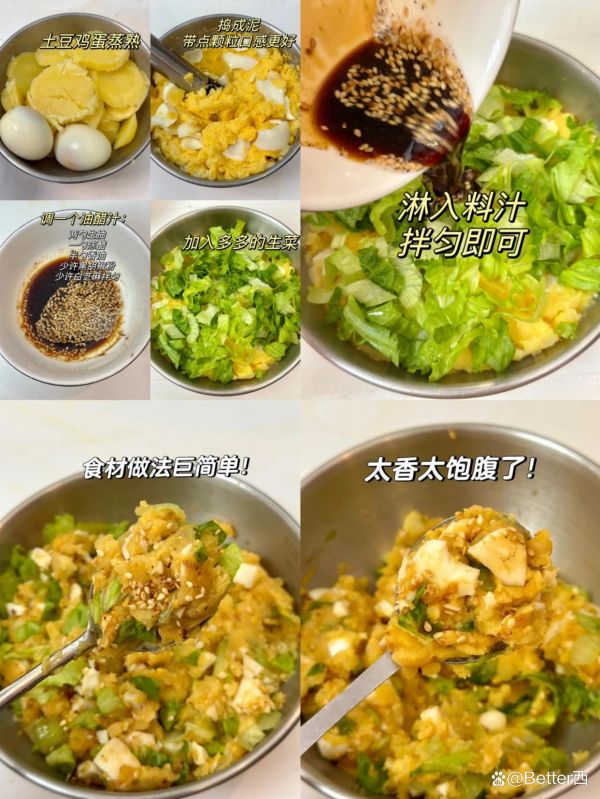 - 生菜加入土豆鸡蛋泥,淋上油醋汁,拌匀即可享用。