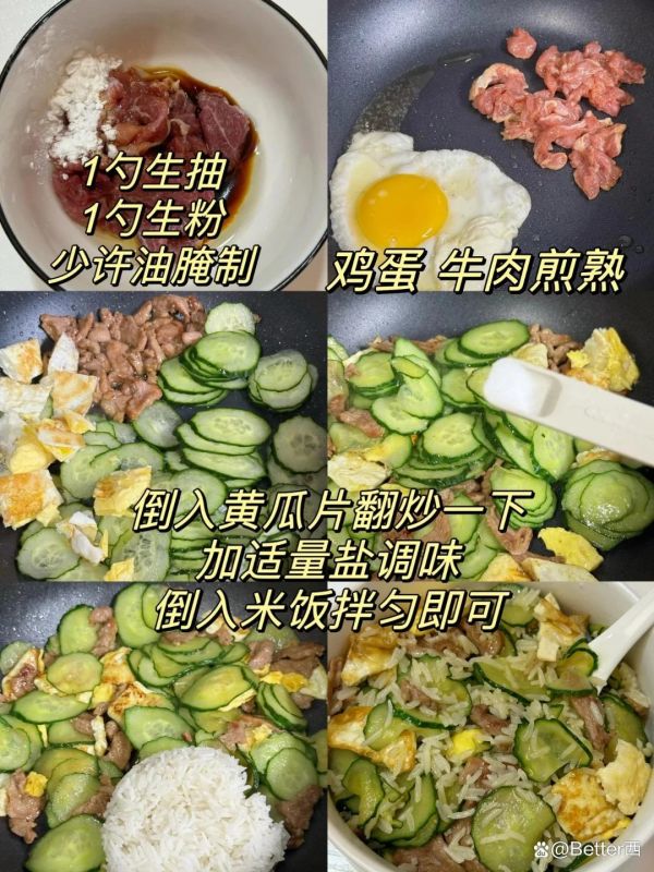 - 黄瓜切片,锅中热油,煎熟鸡蛋、牛肉,加入黄瓜片翻炒,加盐调味,与米饭拌匀。