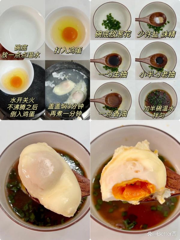 - 汤底调制:葱花、盐、味精、生抽、老抽、香油少许,温水半碗,拌匀,鸡蛋放入汤底即可。