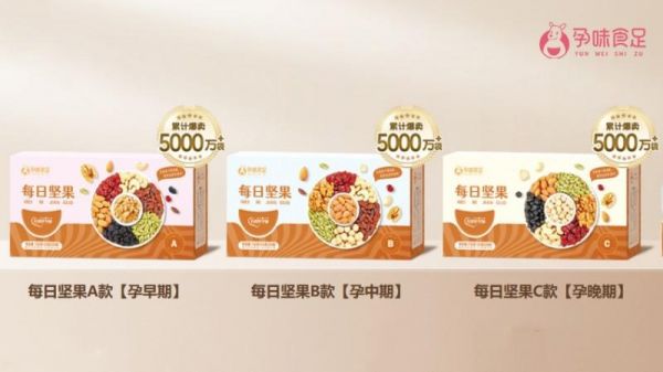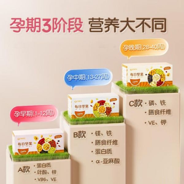 以每日坚果为例,孕味食足将孕期科学分为孕早期、孕中期和孕晚期,并针对性推出A、B、C三款坚果产品。孕早期(A款)强化叶酸及锌元素,协同VB6缓解孕吐反应,护航胚胎神经发育;孕中期(B款)侧重α-亚麻酸与铁元素补充,助力胎儿发育;孕晚期(C款)提升膳食纤维与VE含量,改善肠道功能、减孕期负担。
