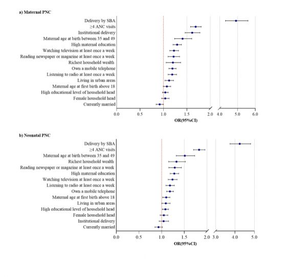 图2:高母亲教育水平表示女性接受了中等教育或以上的教育;户主高教育水平表示该女性家庭户主接受了中等教育或以上的教育;PNC表示产后护理;ANC表示产前护理;SBA表示熟练的分娩助产士;OR表示比值比。