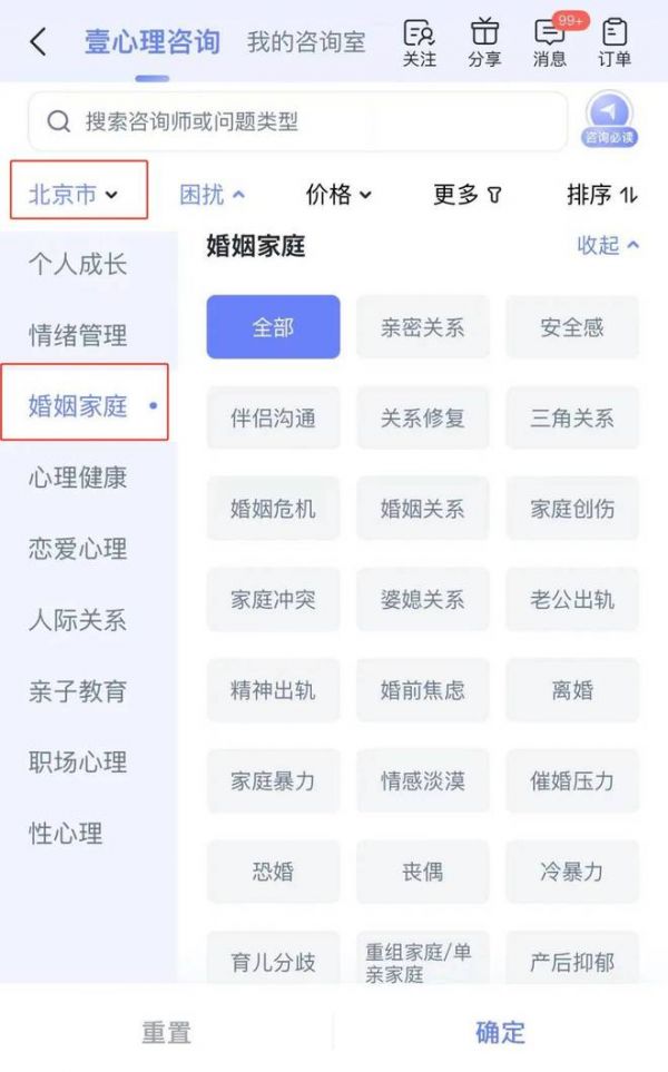 下载登录壹心理App,进入壹心理咨询页面,选择您所在的城市,以北京为例,选择“婚姻家庭”,即可出现您想咨询的问题,列表将为您推荐适合您需求的咨询师为您服务。