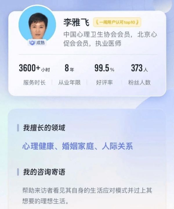 咨询顾问/助理团队人均心理学专业出身,在线响应率25秒以内,近3个月客户满意度达95%,已累积为320000+人提供日常解答服务,并帮助50000+人推荐匹配咨询师,掌握心理咨询起效的机制,对平台咨询师更为了解,可以根据用户的具体需求,有针对性的为用户推荐匹配咨询师,减少自我选择的不确定性,提升筛选效率,让你省钱、省力又省心。
