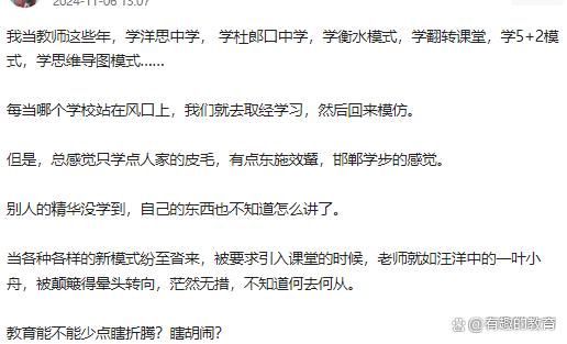 盲目跟风:看到哪个学校因为某种教学模式火了,就迫不及待地引进,却忽略了本校的实际情况和学生的特点。