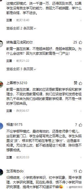 网友们对于教育的瞎折腾、瞎胡闹现象表示了强烈的反感。他们认为,教育的改革应该注重教育教学手段和教学理念的更新,而不是一味地追求新奇和时髦。同时,也强调了教育规律的重要性,认为我们应该继承和发扬老祖宗几千年来为我们总结的教育教学规律,而不是盲目地学习舶来品。这些观点都反映了网友们对于教育改革的期待和对于教育本质的坚守。