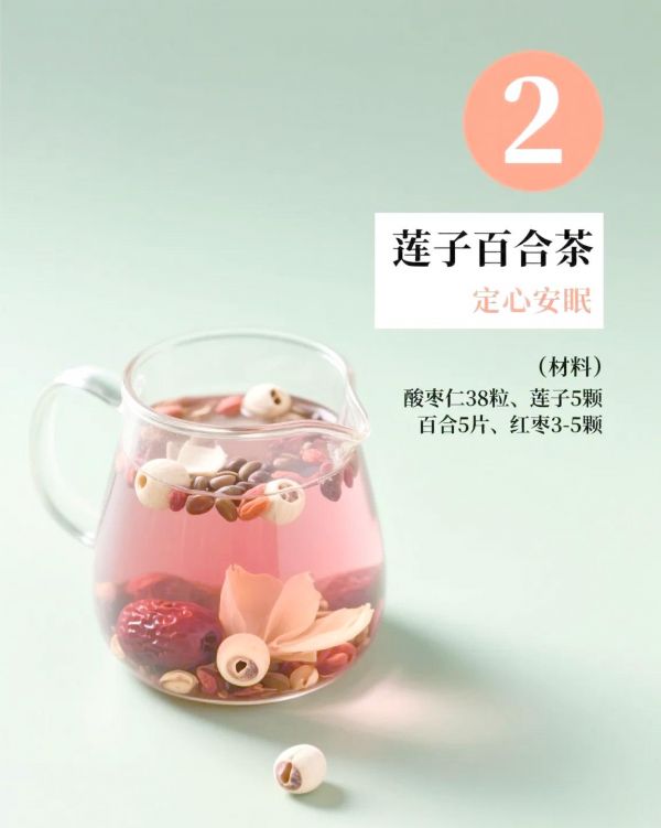 酸枣仁:具有养心补肝、宁心安神的功效,是调理睡眠的经典药材,能够归肝、胆、心经,助力优质睡眠。莲子:不仅能补脾止泻、益肾涩精,还能养心安神,交通心肾,其入心、肾经的特性使其成为调节心神的重要食材。百合:润肺清心、安神定志,与莲子、酸枣仁等食材共同作用,有效调节心神,改善睡眠质量。红枣:补气养血,调和诸味,为茶饮增添营养价值。(二)适宜饮用场合与效果