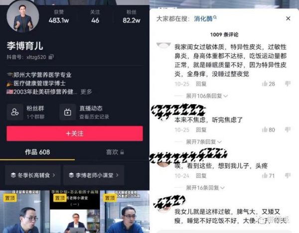 带货派通过搜索“李博谈长高”,搜索到同系列抖音博主“李博育儿”,该博主粉丝量达82.2万,号称医疗健康管理学博士,帮助三万+孩子健康成长,开设了“冬季长高辅食”和“李博老师小课堂”两个合集,置顶视频能看见评论区一片对于孩子身高产生焦虑的家长评论。