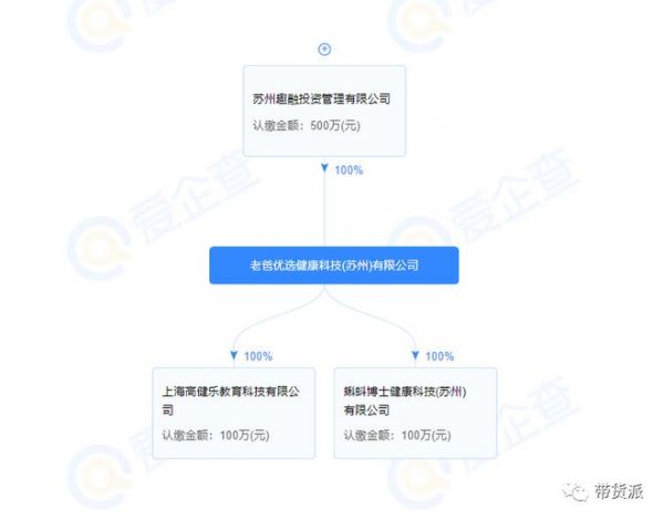 根据股权穿透图可知,该公司由苏州趣融投资管理有限公司全资控股,旗下投资公司有上海高健乐教育科技有限公司和蝌蚪博士健康科技(苏州)有限公司,皆是老爸优选全资控股公司。