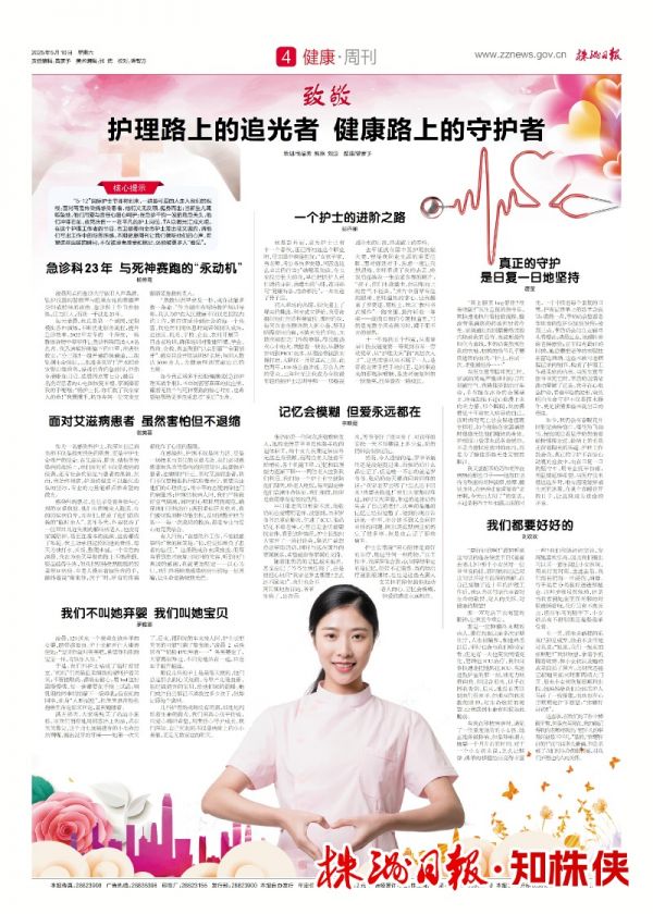 “5·12”国际护士节即将到来,一群最可爱的人走入我们的视线:面对高危传染病感染患者,他们义无反顾、挺身而出;当新生儿呱呱坠地,他们用爱与责任心细心呵护;在急诊千钧一发的危急关头,他们冲锋在前、救死扶伤……在平凡的护士岗位,TA以微光汇成火炬。在这个护理工作者的节日,株洲市卫健委向全市护士发出征文邀约,请他们写出工作中的所思所感。本期健康周刊让我们倾听他们的心声,希望这些温暖的瞬间,不仅被患者感受和铭记,还能被更多人“看见”。