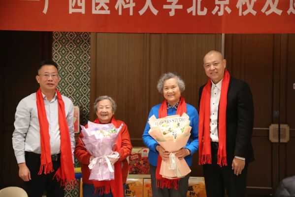 致敬前辈环节尤为动人。陈兴才、陈永强代表母校和诸位晚辈给57级老校友李桂萱教授、58级老校友韦懿馨教授献上鲜花。89岁高龄的李桂萱教授饱含深情地清唱了一曲《萱草花》,她说“萱草花是母亲花,在这辞旧迎新的盛会,献给培养我们、指引我们的母校!”听得在座校友感动地直抹眼泪,拍手叫好。