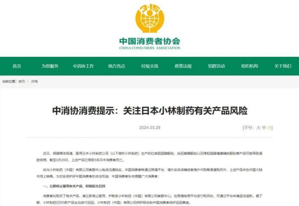 近日,根据媒体报道,服用日本小林制药公司(以下简称小林制药)生产的红曲胆固醇颗粒、纳豆激酶颗粒以及降胆固醇健康辅助颗粒等产品可能导致肾脏疾病,截至3月29日,上述产品已导致5名日本消费者死亡。