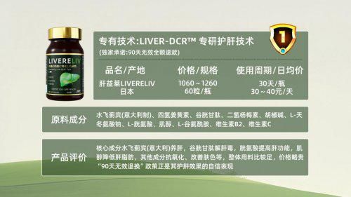 采用Liver-DCRE®修护技术激活肝细胞自愈因子,加快损伤修复的同时,提高肝脏自身调节的功能;应用了iSynergies®协同技术将12种有益于肝脏健康的成分彼此协同增效,“1+1>2”,官方承诺产品90天无效退换。
