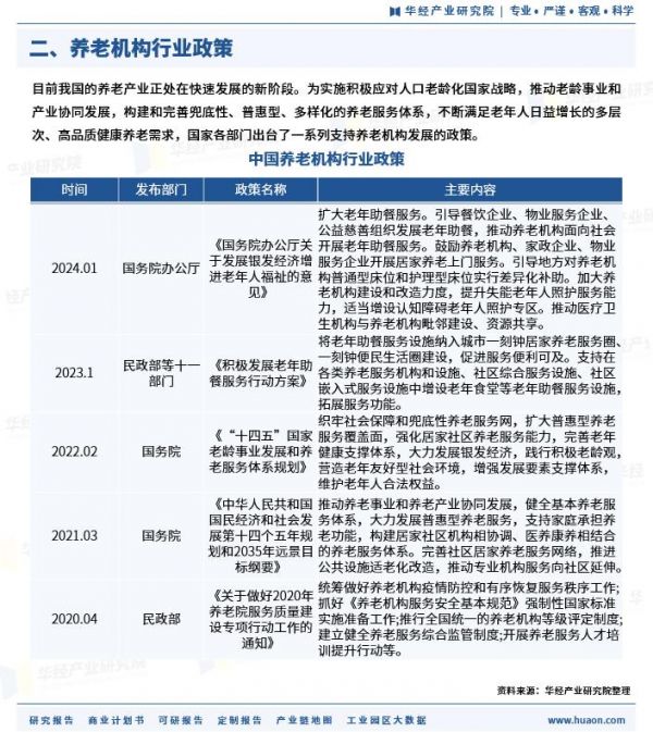 政策:为实施积极应对人口老龄化国家战略,推动老龄事业和产业协同发展,构建和完善兜底性、普惠型、多样化的养老服务体系,不断满足老年人日益增长的多层次、高品质健康养老需求,国家各部门出台了一系列支持养老机构发