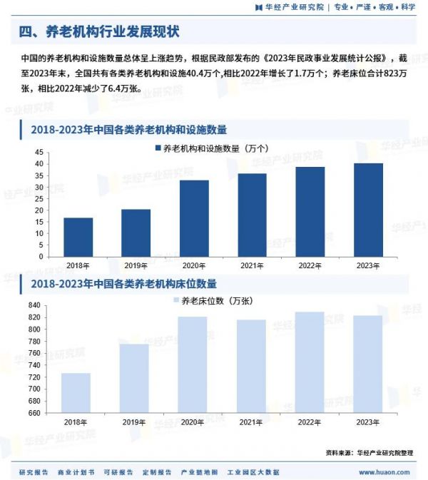 养老机构数量:截至2023年末,全国共有各类养老机构和设施40.4万个,养老床位合计823万张。