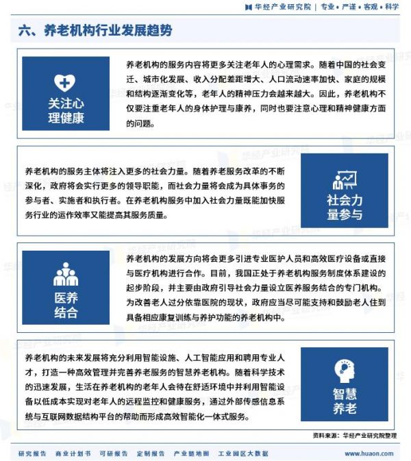 中国养老机构未来将聚焦老年人心理需求,引入社会力量提升服务效率,推进医养结合并加强医疗资源整合,同时依托智能科技构建高效智慧养老体系,实现身心健康与服务质量双提升。
