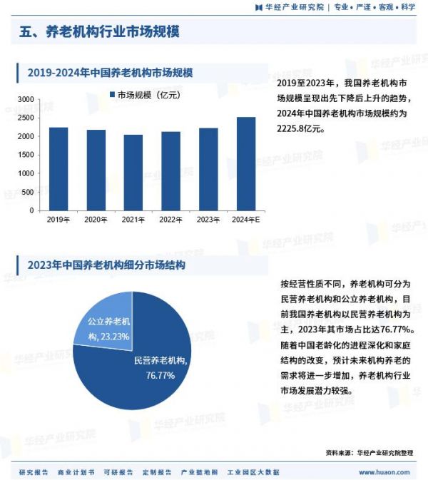 市场规模:2019至2023年,我国养老机构市场规模呈现出先下降后上升的趋势,2024年中国养老机构市场规模约为2225.8亿元。