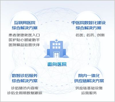 互联网医院综合解决方案中,依然坚持“居民健康”为根本需求,融合数智医疗能力,通过互联网医院帮助医院打造用户便捷就医、解决健康问题的第一入口,不仅服务患病人群,还将服务范围延伸到亚健康、健康人群,提供预防、保健、诊断、治疗、康复等医疗健康管理全流程服务。