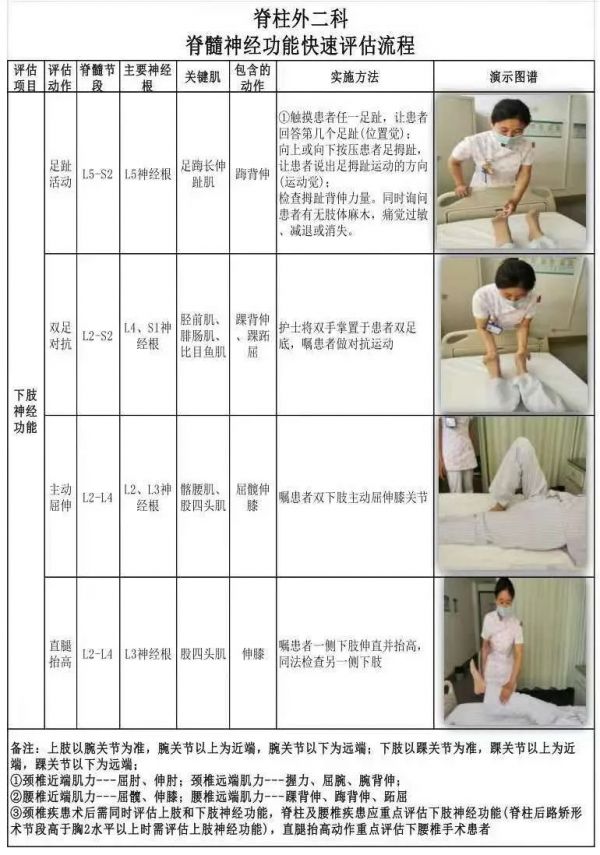 1根据脊髓对肌的节段性支配特点,结合脊髓损伤神经学分类国际标准及临床工作特点,制定脊髓神经功能快速评估项目。评估项目包括上肢神经功能(上臂外展、屈肘对抗、友好握手)及下肢神经功能(足趾活动、用力对抗、主动屈伸、直腿抬高)评估。颈椎疾患术后需同时评估上肢和下肢神经功能,脊柱及腰椎疾患应重点评估下肢神经功能(脊柱后路矫形术节段高于胸2水平以上时需评估上肢神经功能),直腿抬高动作重点评估下腰椎手术患者。
