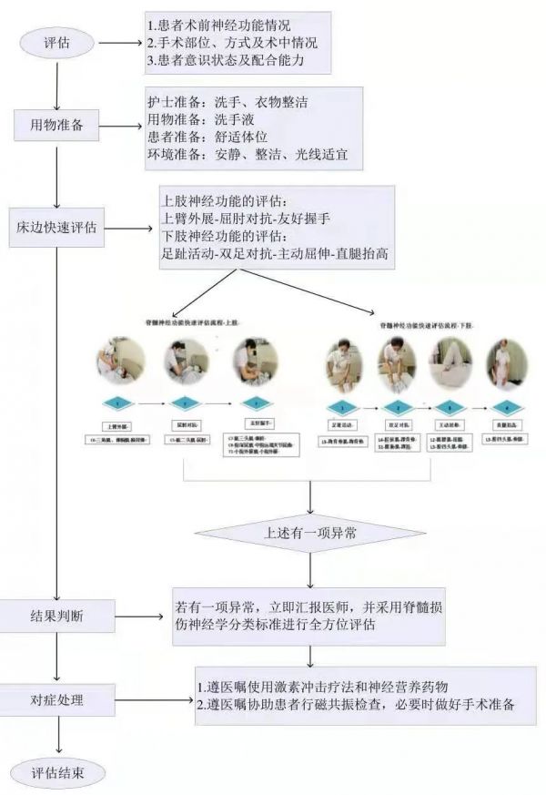 脊髓神经功能快速评估流程图文并茂,能够在较短的时间内快速评估患者神经功能,节省时间。患者手术回来之后能够快速判断其神经功能情况,包括肌力、感觉、运动、位置觉、深感觉。应用神经功能快速评估流程,可缩短评估时间,提高工作效率。