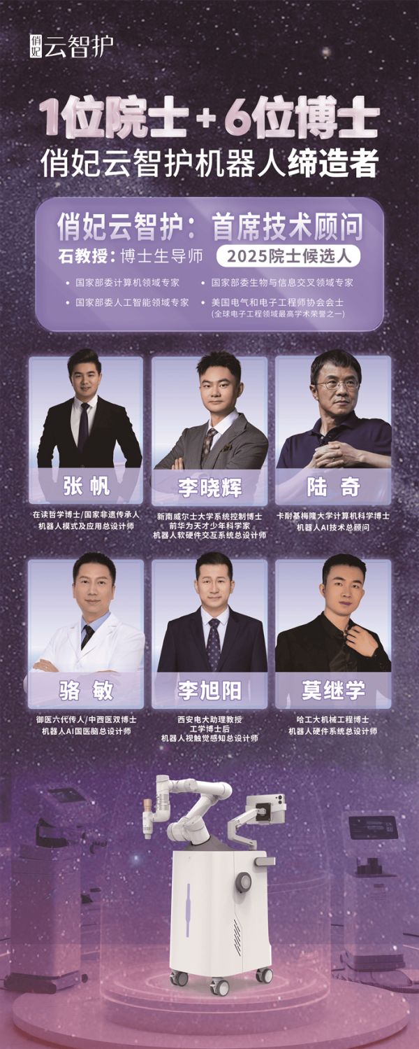 “俏妃云智护机器人”背后是由6位跨学科领域博士的核心研发天团组成。他们分别执掌软硬件交互、AI技术、硬件系统等关键领域,融合中医护理与前沿科技,经数百次迭代测试,铸就兼具技术深度与用户温度的创新成果。