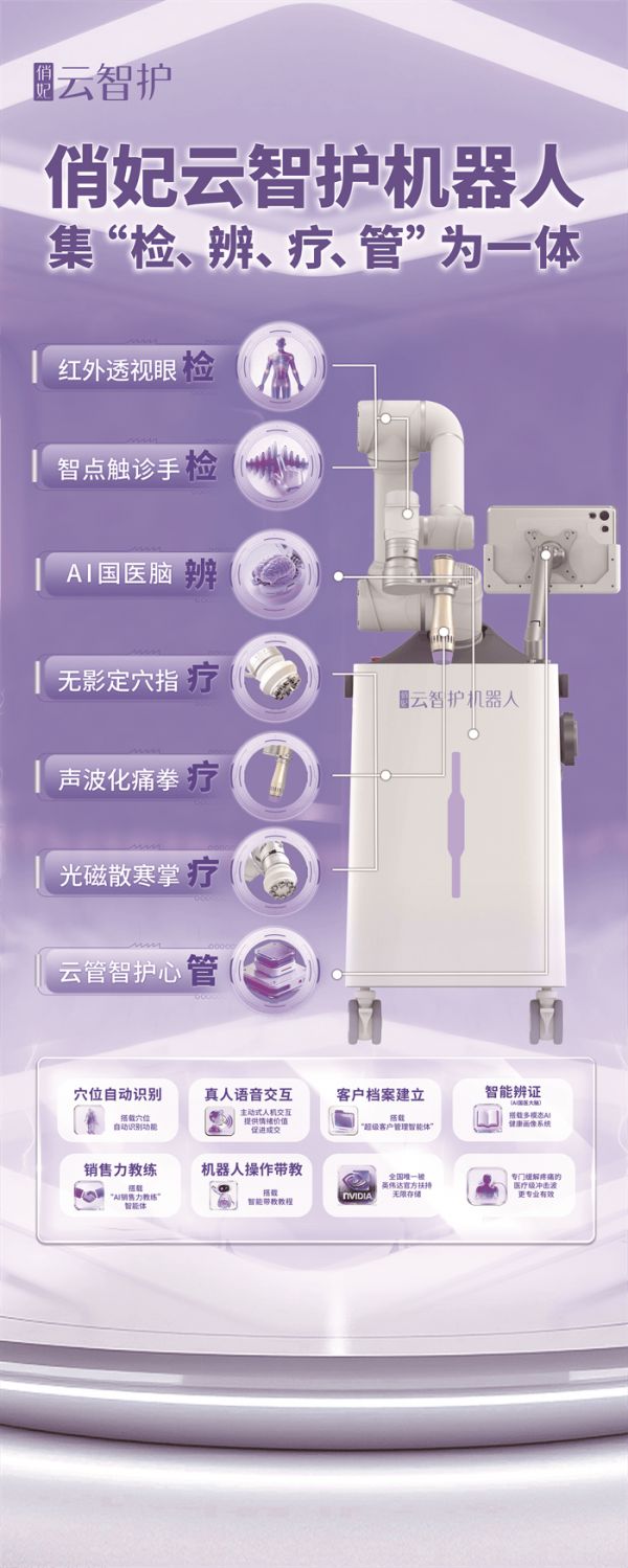 “俏妃云智护机器人”集“检、辨、疗、管”于一体打破传统边界,实现健康护理的精准化、个性化与智能化升级。其搭载红外热成像“透视眼”、“电子触诊手”及六维力控机械臂系统,5秒即可完成全身扫描,3分钟生成涵盖11大系统、120种寒湿问题的量化报告,检测准确度高达96.7%;其搭载基于大数据模型的“AI国医脑”,通过强大的AI算法与国医大师的经验赋能,将传统理疗手法标准化、智能化,做到“发现即解决”。