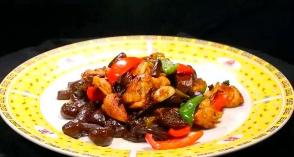 将红菇进行焯水处理后,加入到鸡肉中,同时放入青蒜和彩椒继续煸炒。最后,根据个人口味加入适量的盐和胡椒粉进行调味。出锅前,再淋入三七花茶水,大火收汁后即可出锅装盘。