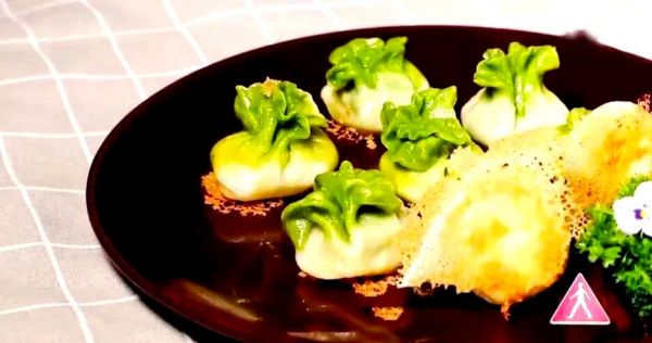 在饺子皮中央放入调好的馅料,将皮捏成四叶形,并细致地捻出叶子的纹理。