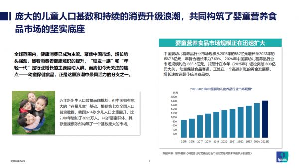 随着科学育儿理念日益普及,消费者对儿童健康需求的精细化程度不断提升,中国婴童营养食品市场正迎来前所未有的发展机遇。尽管近年来出生人口面临挑战,但庞大的存量儿童基数与持续升级的消费能力,共同支撑起一个规模已超千亿且稳步增长的新蓝海。市场预计,行业整体规模将在今年轻松突破1800亿元大关,增速显著高于传统消费品类。