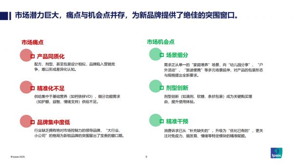 然而,市场在高速扩张中也面临同质化竞争、精准化不足与领导品牌缺失等痛点。这恰恰为新锐品牌提供了突围的窗口。机会点在于对细分场景的挖掘,如户外活动、旅途便携等;在于剂型与体验的创新,以提升儿童接受度;更在于从“补充缺失”到“优化已有”的消费诉求升级,针对免疫力、脑发育、情绪等模块进行精准赋能。