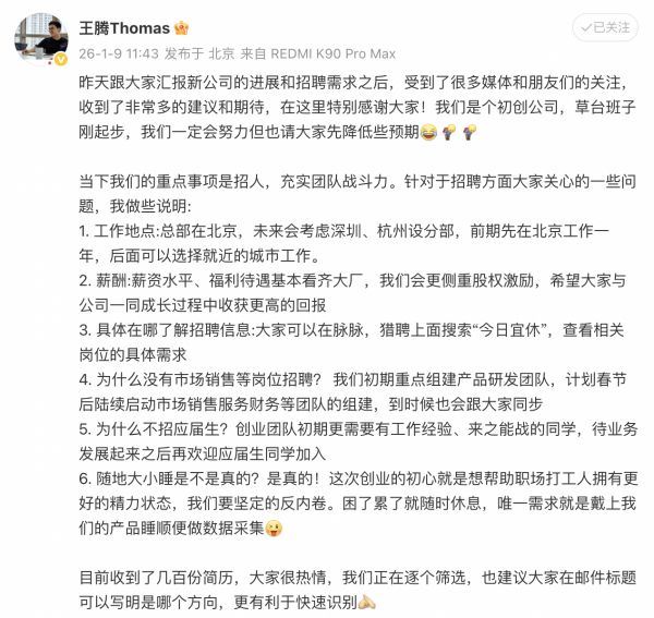 新公司不招应届生、没有市场销售等岗位,小米前高管王腾回应