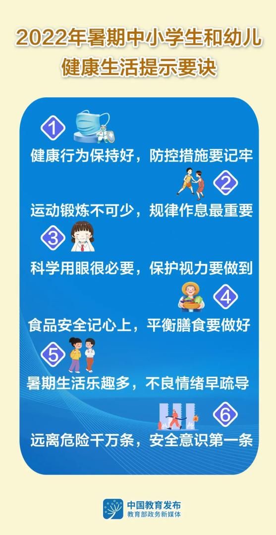 在教育部指导下,全国中小学健康教育教学指导委员会在《2022年寒假中小学生和幼儿健康生活提示要诀》基础上,修订形成《2022年暑期中小学生和幼儿健康生活提示要诀》,引导中小学生和幼儿加强体育锻炼,合理安排假期生活、学习和防疫,均衡膳食营养,保持健康生活方式,做自己健康的第一责任人。跟小编一起来看——