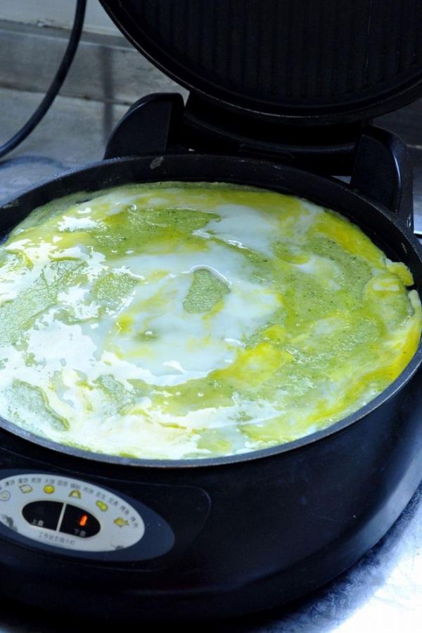 4.电饼铛烧热,舀一勺黄瓜面糊,用木铲均匀摊开后,稍微凝固,磕一个鸡蛋用木铲拨均匀。