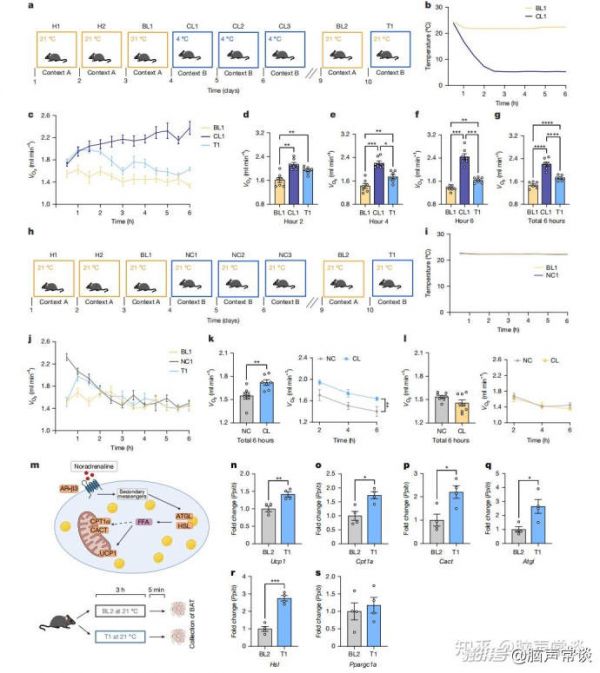 小鼠在21°C(情境A)和4°C(情境B)环境下进行训练。通过测量氧气消耗、二氧化碳产量及活动量等指标来评估代谢率变化。在4°C环境中,小鼠的代谢率显著增加,表现为更高的氧气消耗、能量支出以及活动量。当小鼠被重新置于之前经历4°C寒冷挑战的情境B中时,即使实际环境温度为21°C,它们的代谢率仍然增加。这表明小鼠能够将特定环境与温度信息关联起来,这种现象是由情境线索而非新奇性引起的。排除了新奇性和一般性压力反应对代谢率的影响,例如暴露于捕食者气味并未导致代谢率增加。实验还证实了冷记忆的回忆而非长期寒冷暴露的效果或一般的压力反应引起了代谢率的增加。研究显示,在冷记忆召回期间,BAT中的多个产热基因(如UCP1、Cpt1a、Cact、Atgl和Hsl)也会上调。这些基因的上调有助于非颤抖性产热,是小鼠适应寒冷环境的关键机制之一。冷记忆不仅能够提高全身代谢率,还能引起回避行为。小鼠可以通过形成冷记忆来调控全身的体温调节反应,这些记忆使得它们能够在回忆起寒冷环境时调整自身的代谢率和行为以应对寒冷。总之,该研究揭示了小鼠可以基于冷记忆调整其生理反应,从而更好地适应不同的温度环境。